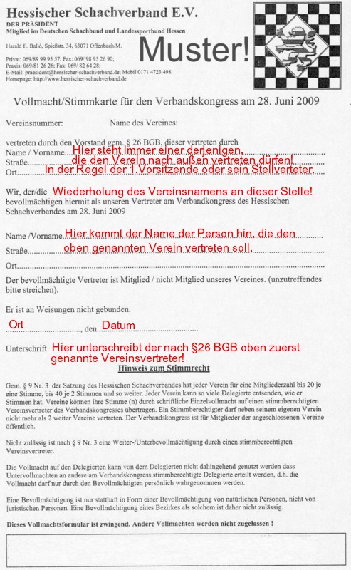 Eine gute Frage! Auf dem letzten Kongress war die Unsicherheit in dieser Frage klar spürbar, deshalb wurde letztlich auch abgebrochen. Im Musterformular sind einige Passagen rot eingefügt, die beim grundsätzlichen Ausfüllen helfen sollen. Weiter unten folgen weitere Hinweise. Die ihnen zugegangenen roten Vollmachten/Stimmzettel sind wichtig und sie sollten Sie beim Kongress dabei haben oder demjenigen übergeben, der den Verein vertreten soll. Das Präsidium erkennt nur diese Formulare im Original an. |